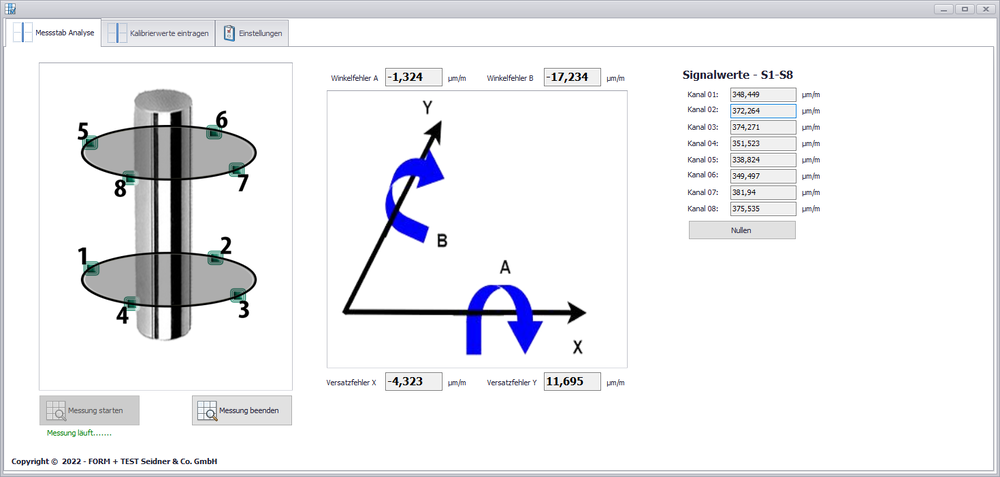 Az ASTM E 1012 szabvány például általános eljárást biztosít az axiális hiba miatti hajlítónyomaték meghatározására és pontossági osztályokba sorolására. Itt le van írva, hogy a nyúlásmérő műszerek segítségével kell használni a hajlító alakváltozás magasság és irány szerinti meghatározására. Erre a célra általában egy kalibrációs rudat használnak, amelyet a megfelelő nyúlásmérőkkel együtt alkalmaznak. Az intelligens szoftver ezután a mért alakváltozások alapján nemcsak a hajlítási komponensek magasságát és irányát határozza meg, hanem a hiba típusát is, azaz a tengelyeltolódásra és a szöghibára való felosztást. Ezután egy igazítóegység segítségével beállítócsavarok segítségével célzottan korrigálhatók ezek a tengelyhibák. Ez a helyszínen történik, miközben a kalibráló rúd a terhelési sorba van szerelve és terhelés alatt van. A FORM+TEST kifejlesztett és sikeresen alkalmazza az erre a célra szolgáló, akár 500 kN dinamikus terhelésű igazítóegységeket. A FORM+TEST a tengelyhibák méréséhez szükséges összes tartozékot is kínálja.